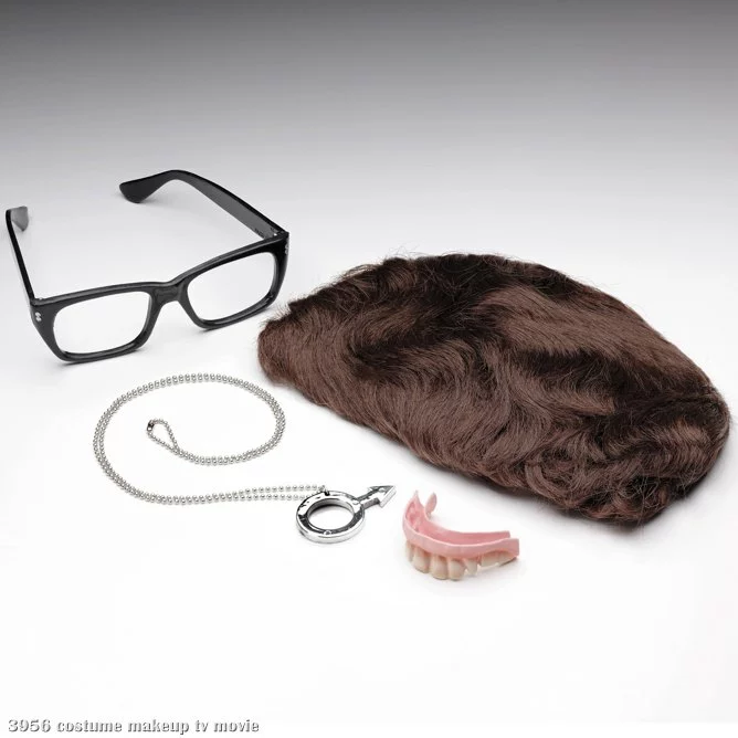 Perfect for looking groovy this Halloween! This deluxe kit includes black rim glasses, a brown wig, stained teeth and silver color medallion.