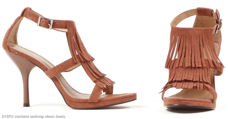 Funky heels with a Native American twist, these shoes are the perfect way to complete your Native look! The Brown Fringe High Heeled Adult Shoes include a pair of brown 4″ sandals with three layers of fringe on the front.