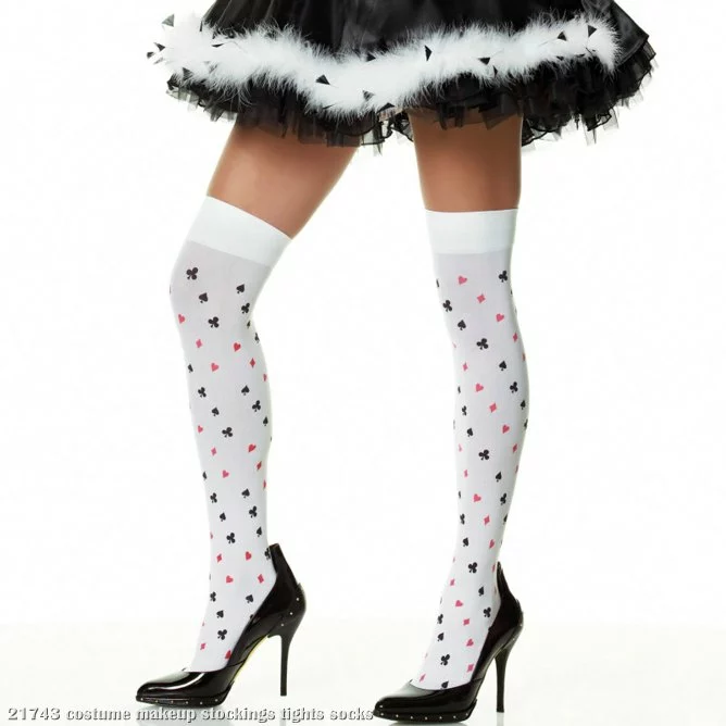 Be the queen of breaking hearts in these sexy thigh highs. Includes a pair of opaque white thigh highs with card symbols.