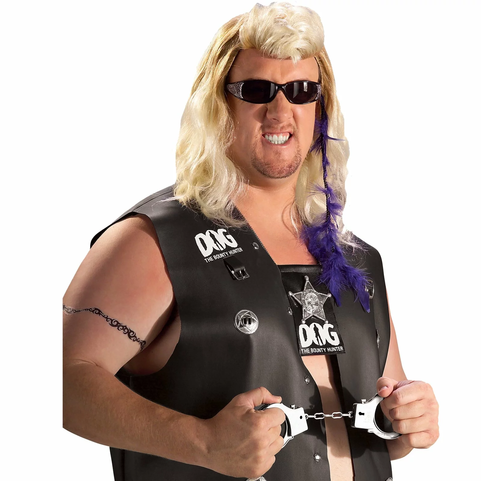 Duane “Dog” Chapman, the world famous bounty hunter. The Dog The Bounty Hunter – Dog Costume Kit includes white/blonde curly mullet wig, feathered hair clip, black sunglasses, badge on chain and plastic handcuffs.