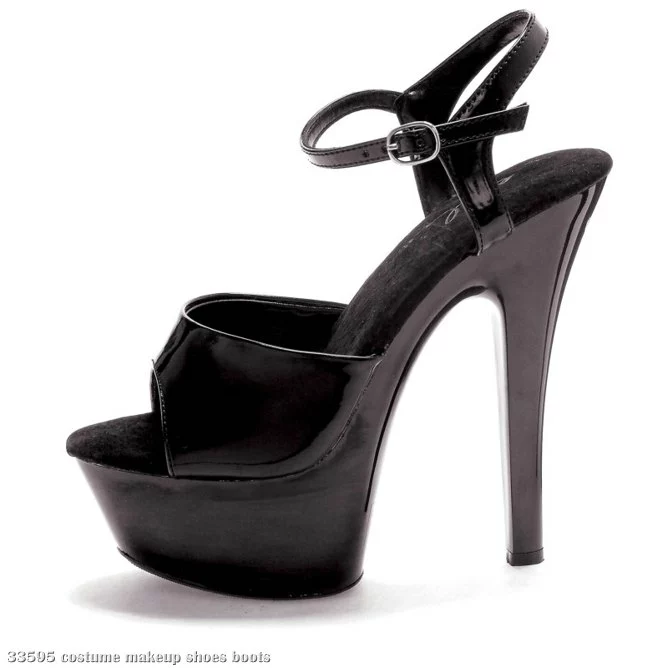 The classic black sandal with some extra height. Juliet Shoes are a black platform sandal, with peep toe, ankle strap with side buckle, 6″ stiletto heels, on a 2″ platform.