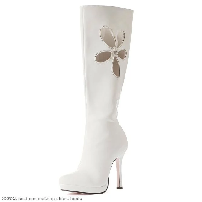 The White “Lovechild” Go-Go Boots feature a 4″ heel, a flower cut-out calf design, a ½” Platform sole and zipper up the inside. Whether you are a sexy superhero saving the world from imminent doom, or a mod-maven shakin’ your groove thang on the dance floor, these boots are a flirty and feminine finishing touch!