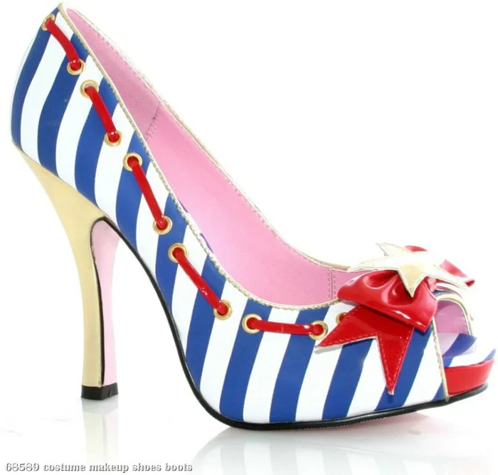 Come sail away in these spectacularly seaworthy shoes! These peeptoe Marina pumps feature a 4-inch heel, nautical-themed striped pattern with red bow accent, gold star detail and a porthole-inspired eyelet lace-up design. Anchors aweigh!