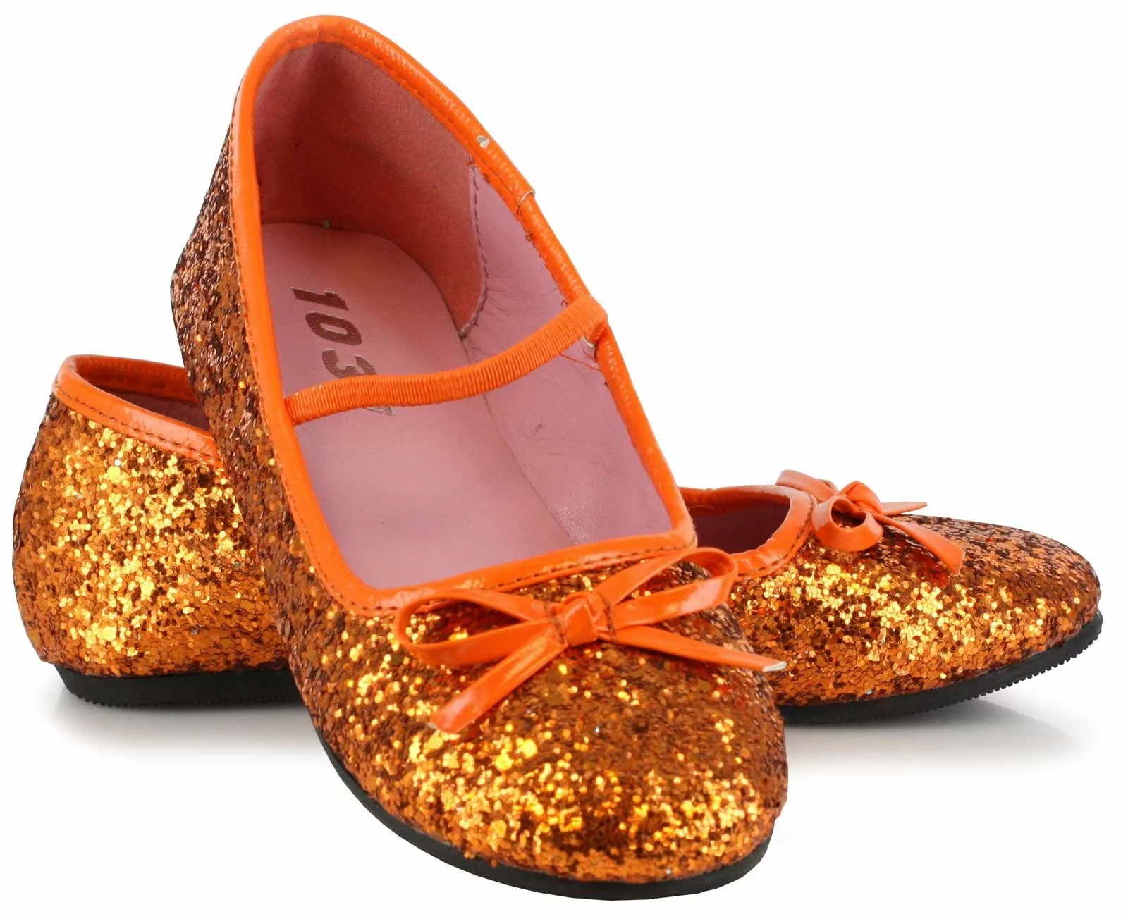 This product includes one pair of Orange Sparkle Ballet Flats. Available in Child sizes X-Small (9/10), Small (11/12), Medium (13/1), Large (2/3), and X-Large (4/5). Remember, even Cinderella had to try on her shoes! Please make sure that your shoes fit and are comfortable before you use them. Shoes that show obvious wear or are missing the original packaging are not returnable.