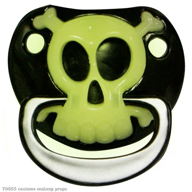 A Pirate’s Life for Baby! If your Little Buccaneer needs a pacifier, make sure it matches his Pirate look! The Pirate Pacifier features a black pacifier with a white glow-in-the-dark skull in the center and a black handle.