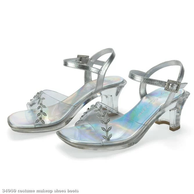A Beautiful sparkly sandal that could be worn any day or with a costume, these shoes are perfect for your Little Princess! These sandals feature a clear heel and foot strap with silver leaf accents and a silver ankle strap.