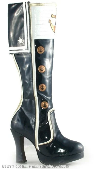 A sea-faring, high-stepping, salute-getting sexy look, these boots complete any sexy sailor costume! The Skipper Adult Boots include a pair of blue knee-high boots with red and white trim and a white cuff with a gold anchor detail on the front.