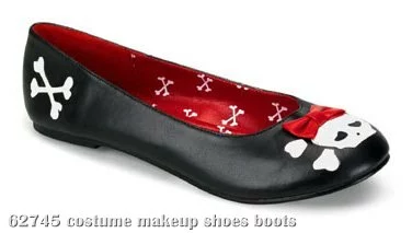 You’ll never have to walk the plank in these perky pirate shoes! Includes one pair of black flats featuring a skull accent on the toe and a cross-bone on the heel. An attached red bow is also included in this girlie gothic look.