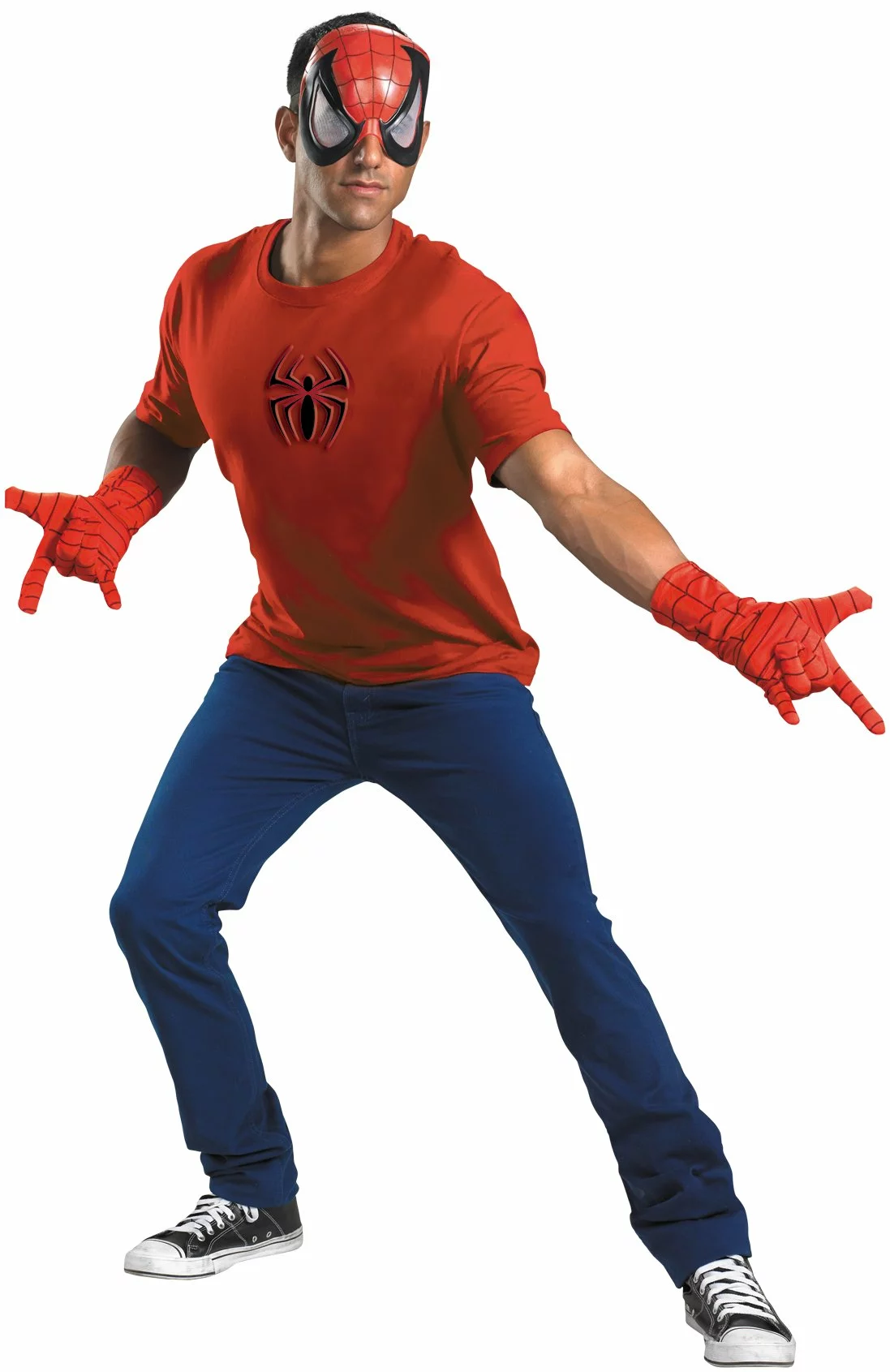 Then you’ll surely be catching thieves just like flies in the Spider-Man Accessory Kit (Adult) which includes: A web printed half mask with mesh eyes, stylized spider emblem and a pair of web print gloves.
