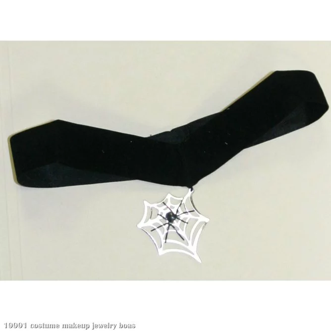 This choke is a perfect finishing touch for your vampire or witch costume. A black velvet ribbon choker with a silver color web pendant and a black spider accent. Closes in back with velcro.