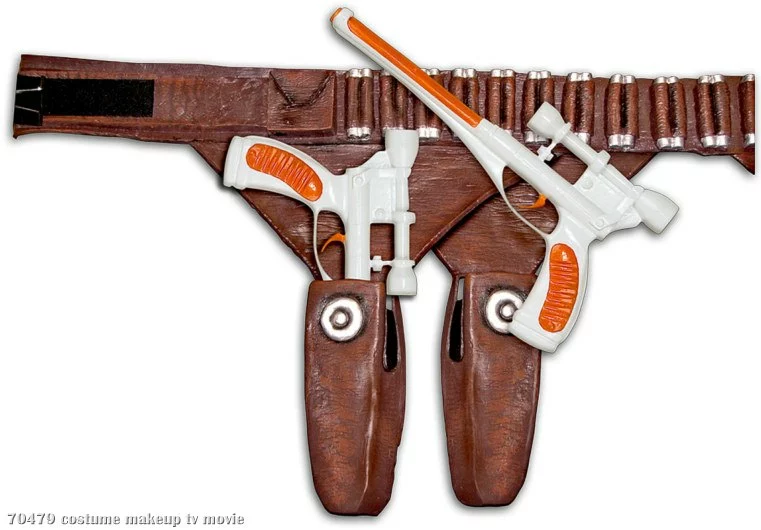 Transform into the most feared mercenary ever seen during the Clone Wars this Halloween! Complete your Cad Bane costume with this cool brown faux leather holster belt and (2) guns. Guns make an authentic action sound!