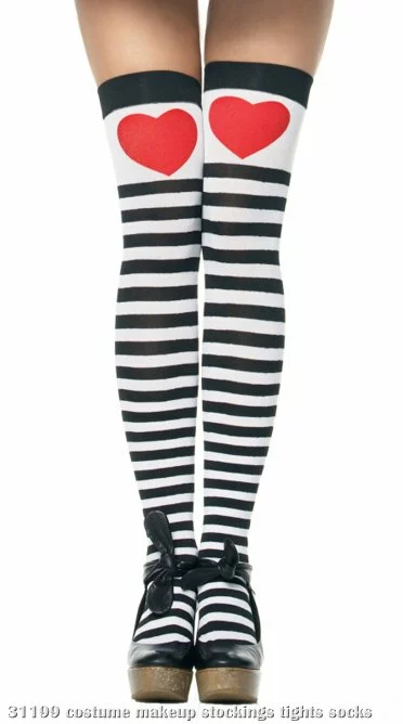 Complete your Miss Wonderland costume (sold separately) with these black and white striped stockings with a red heart.
