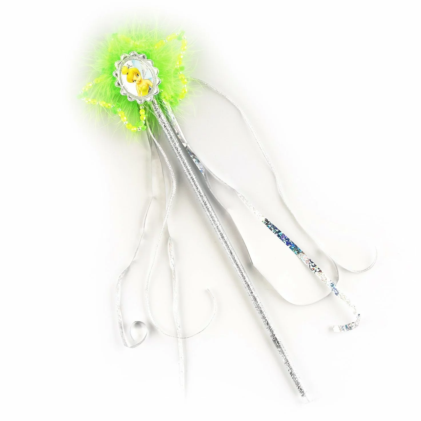 What would Tinker Bell be without her magical wand? This officially licensed ©Disney wand is a Tinker Bell cameo with sequin accents, on a silver stick with silver ribbons.