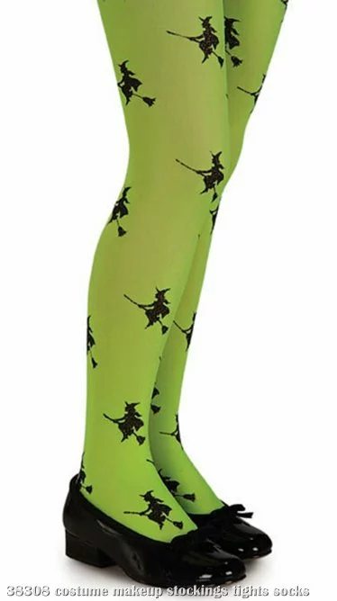 Add a little pizzaz to her witch’s costume with these bright green tights featuring miniature witches flying on broomsticks